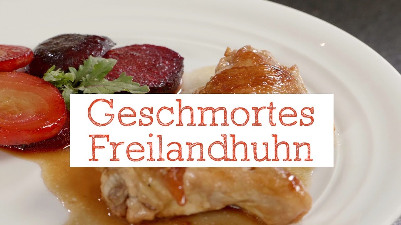 Geschmortes Freilandhuhn mit gebratenen Rüben und Wildkräutersalat