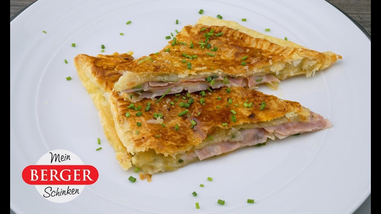 Schinken-Käse-Ecken im Backofen 20 Minuten auf der mittleren Einschubleiste backen. In Dreiecke schneiden und kurz überkühlen lassen.