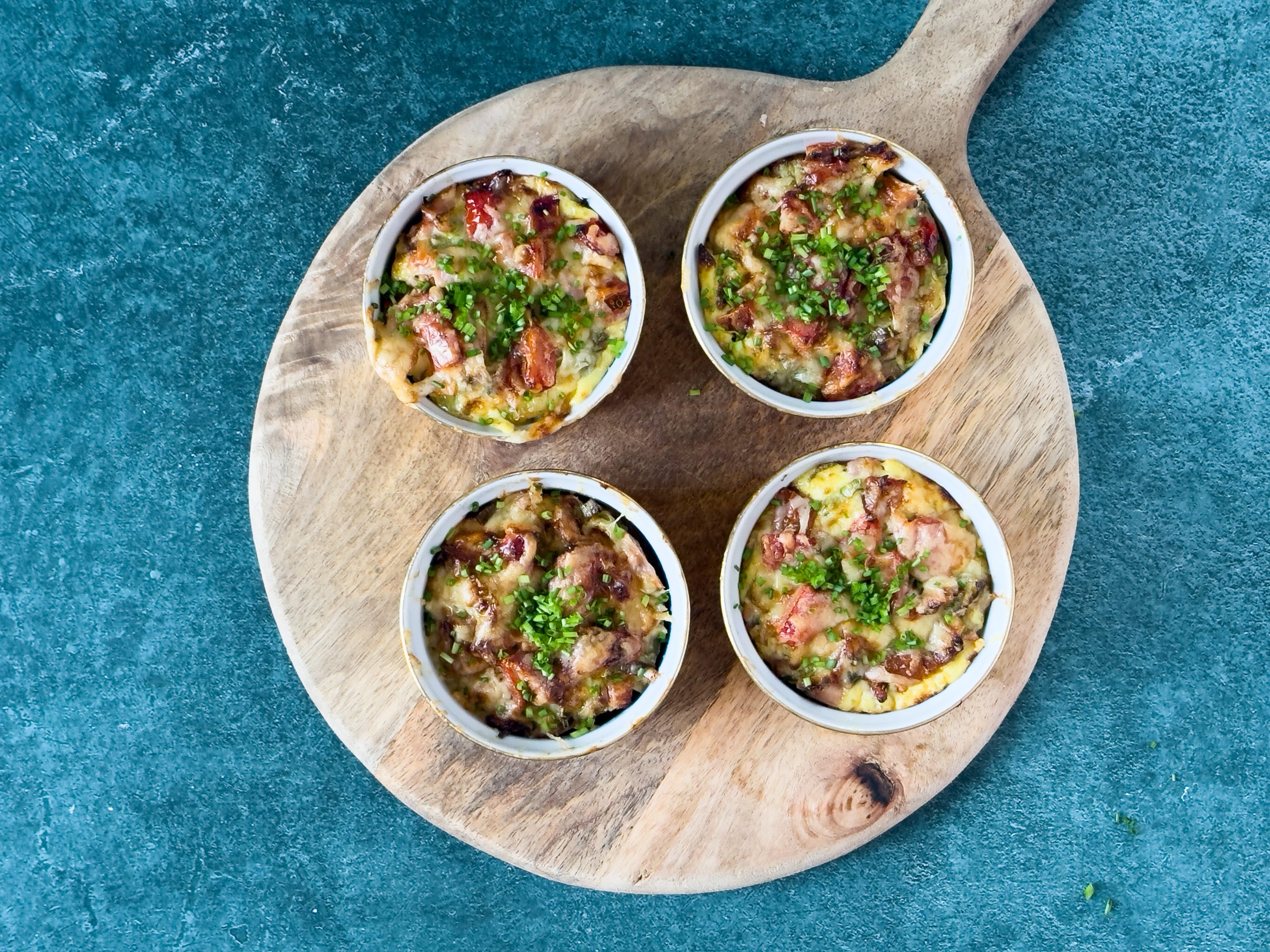 Ein Brunch trägt den großen Vorteil im Konzept, dass man lange schlafen kann und sich eine Mahlzeit spart. Soweit die Theorie. Wenn man zum Brunch aber mehr als ein Marmeladebrot auftischen möchte, kann man schon wieder einen guten Teil der Bettzeit abziehen. Außer, man findet ein Rezept, das schnell geht und trotzdem etwas Besonderes in sich trägt. Wie dieser Brunchauflauf. Man kann ihn sogar schon am Vorabend fast fertig machen und in der Früh nur mehr in den Ofen schieben. Easy Brunch: check.